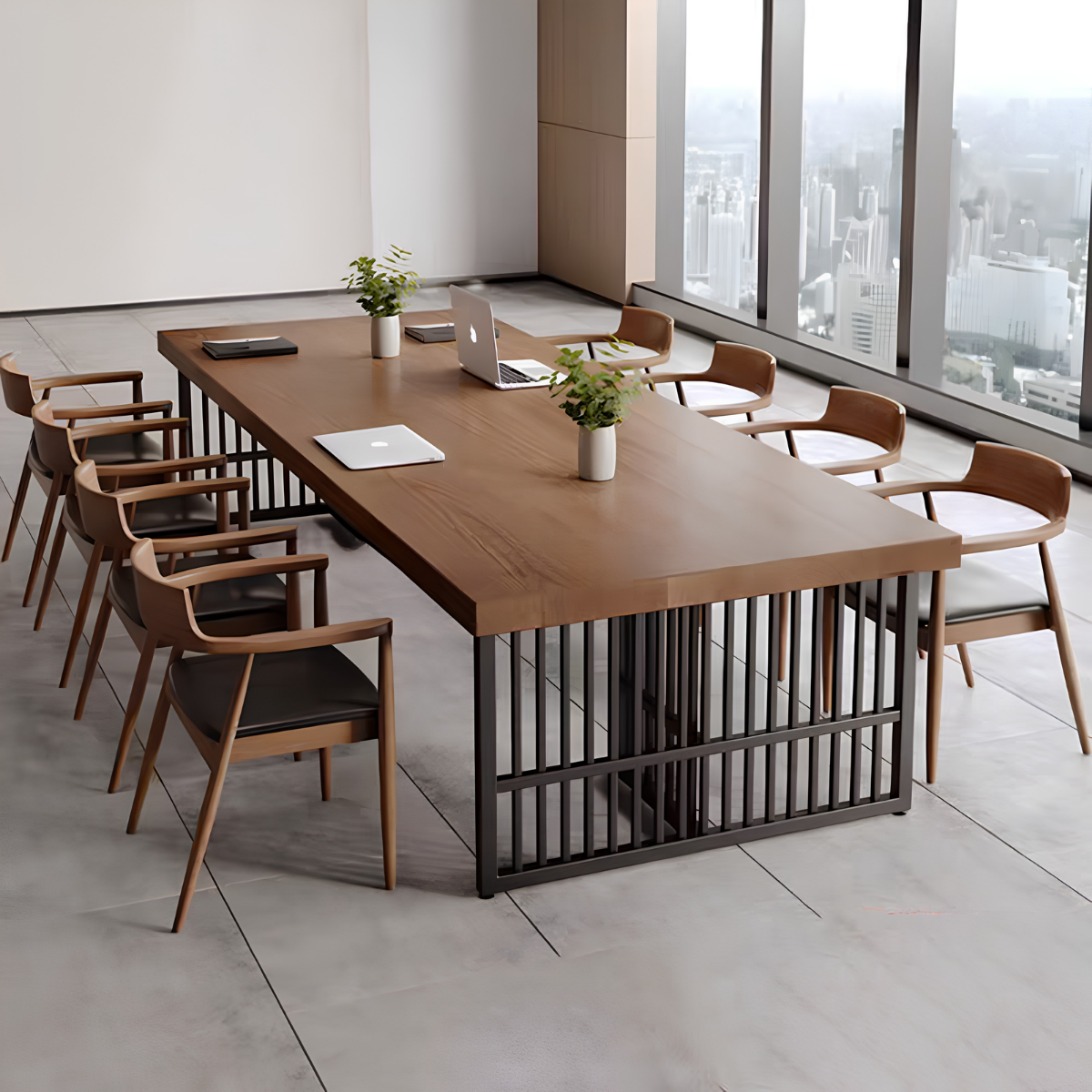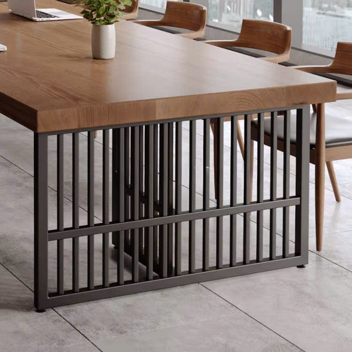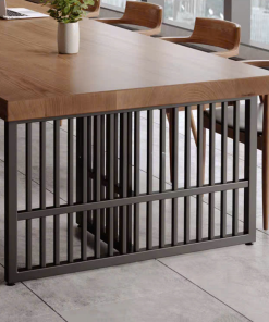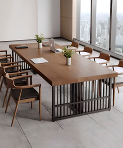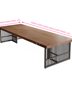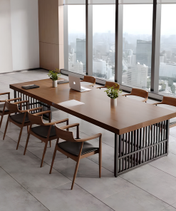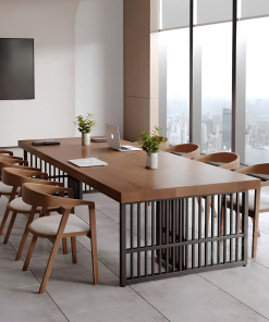 Bàn họp chữ nhật thiết kế đơn giản và tiện dụng, mẫu bàn mặt gỗ chân sắt này gây ấn tượng với thiết kế hiện đại, thanh lịch nhưng vẫn giữ được nét tinh tế riêng. Phần mặt bàn sử dụng gỗ công nghiệp đạt chuẩn, an toàn và thân thiện với môi trường, các góc cạnh được bo cong khéo léo tạo cảm giác mềm mại và dễ chịu khi sử dụng. Khung chân sắt sơn tĩnh điện thiết kế theo kiểu chân choãi hoặc chữ U tối giản, vừa giúp không gian dưới bàn thông thoáng, vừa tăng sự gọn gàng cho tổng thể căn phòng. Lớp sơn tĩnh điện cao cấp hỗ trợ chống oxy hóa hiệu quả, đồng thời mang đến bề mặt bóng mờ sang trọng và bền đẹp theo thời gian. Sự kết hợp hài hòa giữa chất liệu gỗ mộc mạc và kim loại mạnh mẽ đã tạo nên một chiếc bàn mang phong cách lãnh đạo trẻ trung, chuyên nghiệp và đầy cởi mở.
