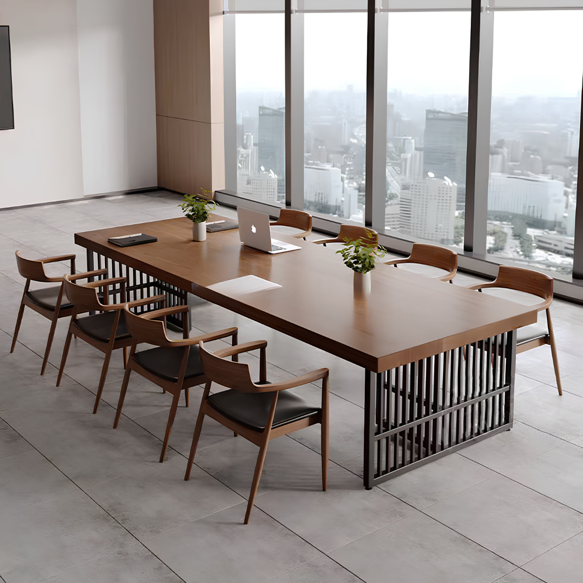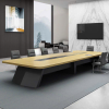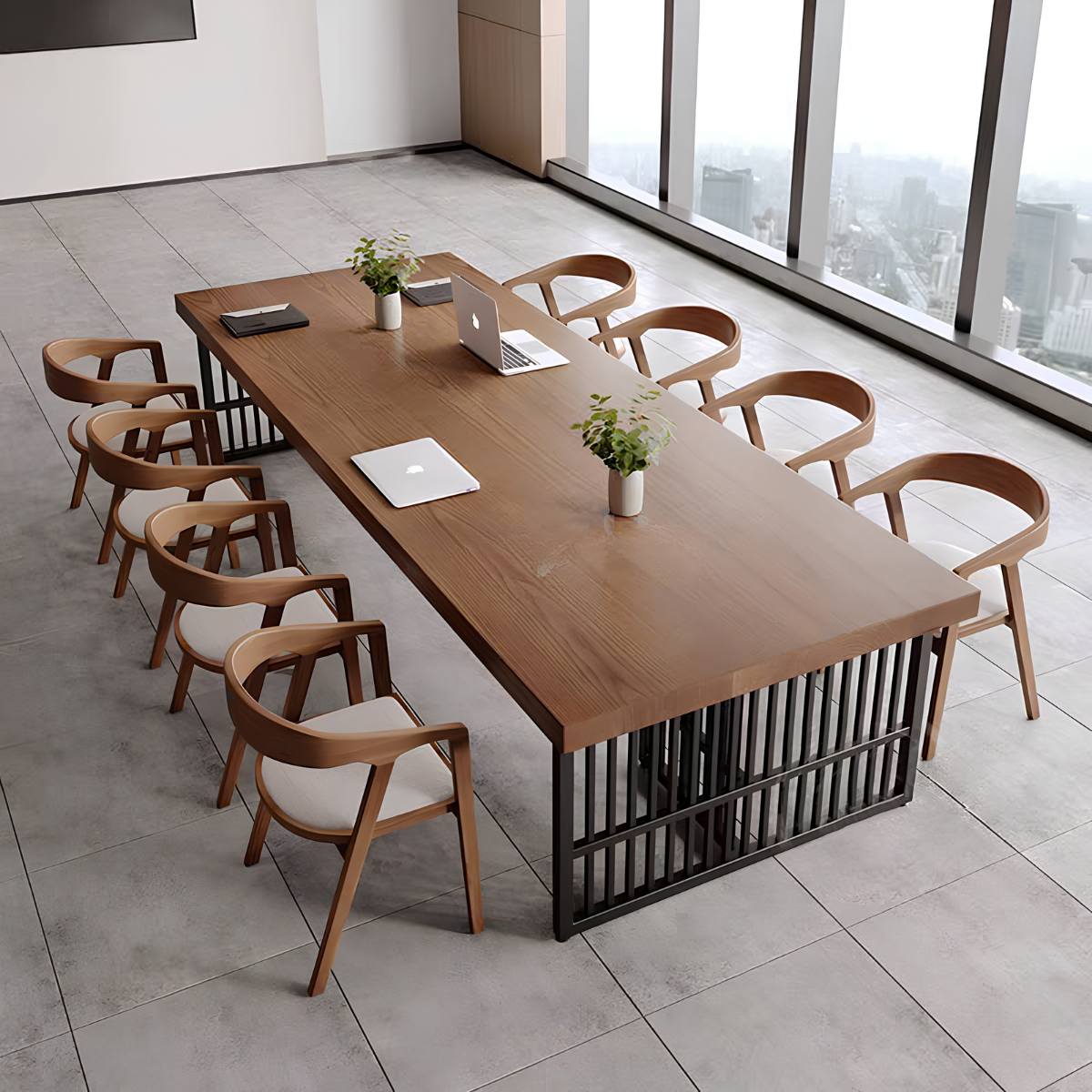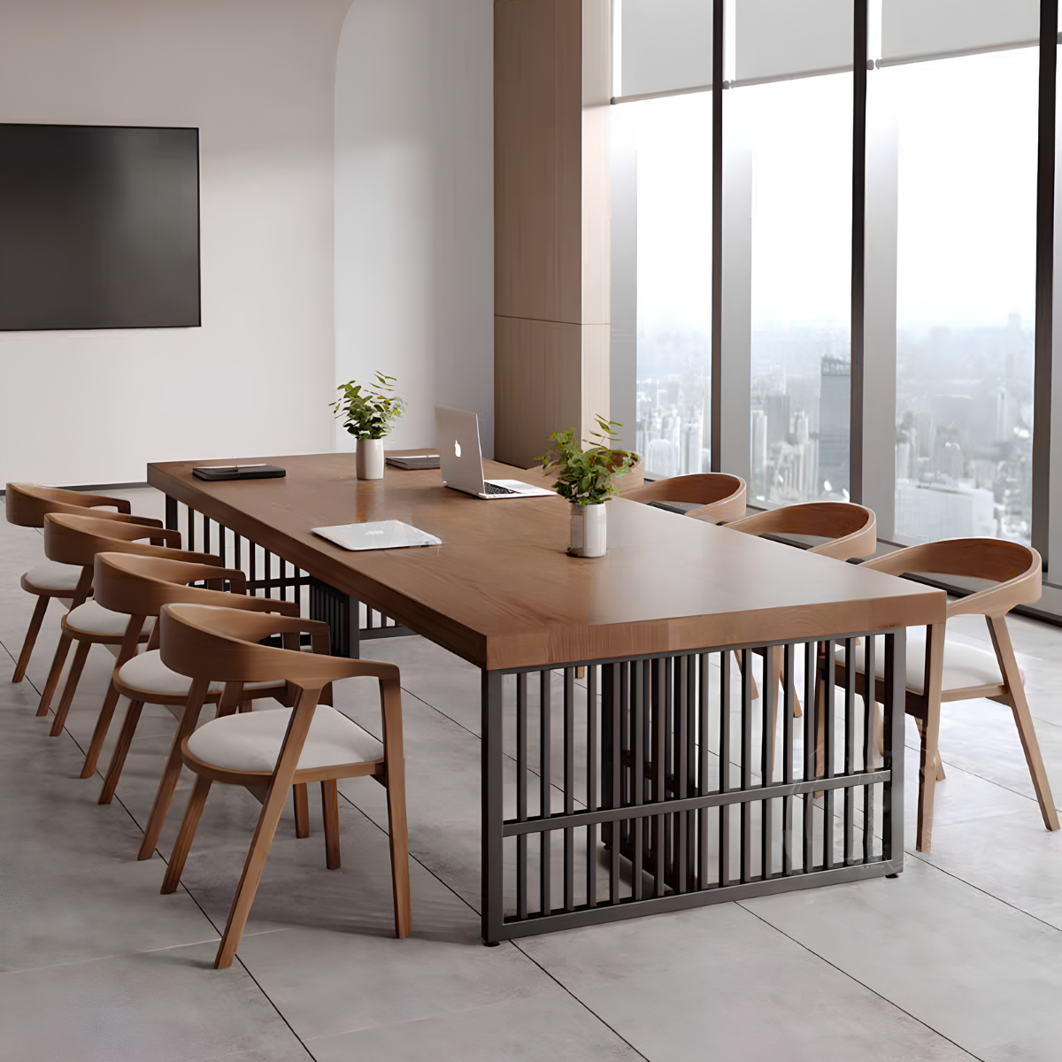 Bàn họp chữ nhật thiết kế đơn giản và tiện dụng, mẫu bàn mặt gỗ chân sắt này gây ấn tượng với thiết kế hiện đại, thanh lịch nhưng vẫn giữ được nét tinh tế riêng. Phần mặt bàn sử dụng gỗ công nghiệp đạt chuẩn, an toàn và thân thiện với môi trường, các góc cạnh được bo cong khéo léo tạo cảm giác mềm mại và dễ chịu khi sử dụng. Khung chân sắt sơn tĩnh điện thiết kế theo kiểu chân choãi hoặc chữ U tối giản, vừa giúp không gian dưới bàn thông thoáng, vừa tăng sự gọn gàng cho tổng thể căn phòng. Lớp sơn tĩnh điện cao cấp hỗ trợ chống oxy hóa hiệu quả, đồng thời mang đến bề mặt bóng mờ sang trọng và bền đẹp theo thời gian. Sự kết hợp hài hòa giữa chất liệu gỗ mộc mạc và kim loại mạnh mẽ đã tạo nên một chiếc bàn mang phong cách lãnh đạo trẻ trung, chuyên nghiệp và đầy cởi mở.