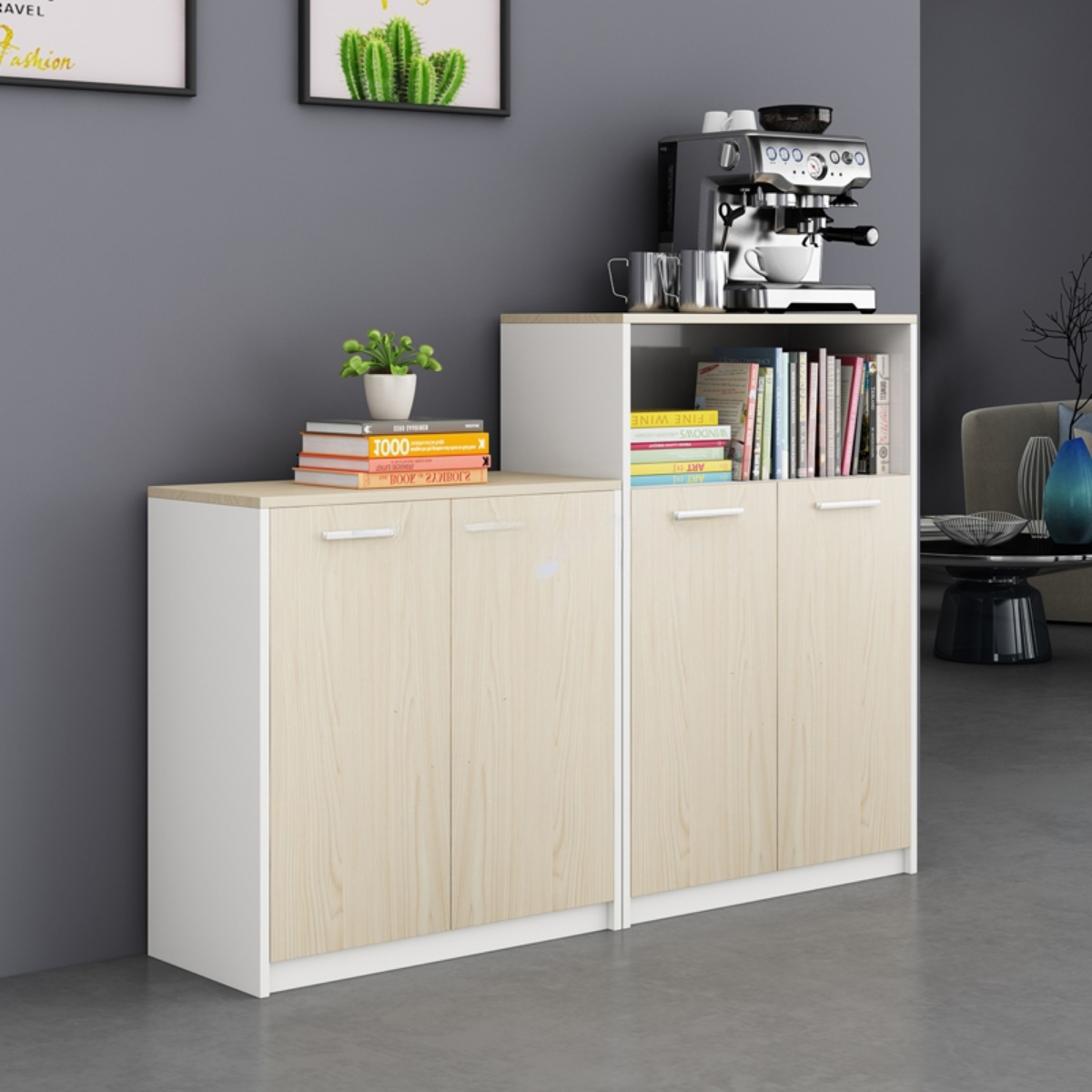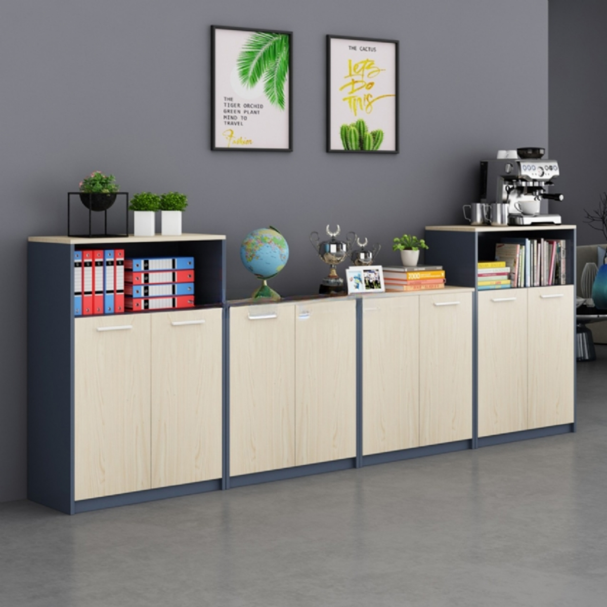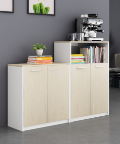 Mặt tủ và cánh cửa được làm từ gỗ MDF phủ Melamine cao cấp, mang đến bề mặt đẹp mắt, hiện đại cùng khả năng chống nước và chống mối mọt hiệu quả. Tủ được thiết kế với nhiều ngăn và nhiều tầng tiện dụng, phù hợp để lưu trữ đa dạng vật dụng như kẹp hồ sơ, sách, tạp chí và các tài liệu cần sắp xếp gọn gàng.